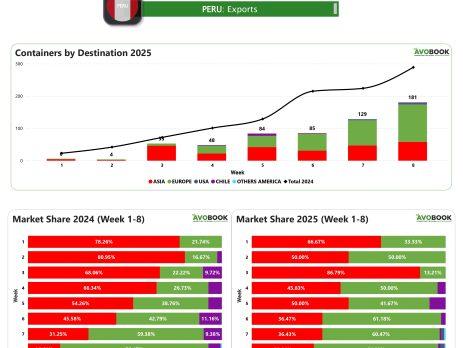 Perú mostró un notable crecimiento en este cierre de la semana 8, con un total de 181 contenedores enviados. Esta cifra representa un incremento del 40% en comparación con la semana anterior, reflejando una tendencia al alza en la producción y comercialización del país.
