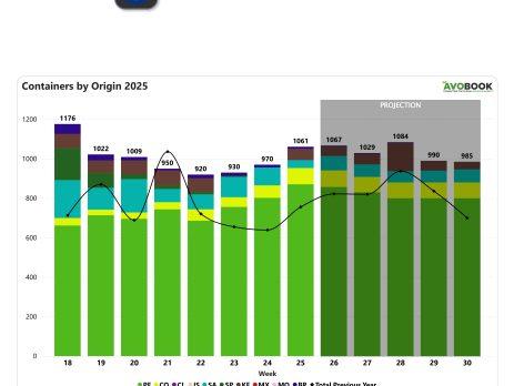 El abastecimiento continúa dominado por Perú, que representa el 82% del total. Este país no solo incrementó su volumen en un 8% con respecto a la semana previa, sino que alcanza en esta ocasión su punto más alto de envíos al mercado europeo en lo que va de la temporada. No obstante, el volumen general aún se mantiene por debajo de los registros más altos observados semanas atrás, cuando el total se acercó a los 1.200 contenedores, aunque en aquel momento con mayor diversidad de orígenes.
