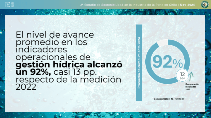 Si bien, el sector ya cuenta con altos niveles de tecnificación de riego, lo que permite darle un uso eficiente al recurso hídrico, el nivel de avance promedio en los indicadores operacionales de gestión hídrica mejoró y alcanzó un 92%. Es decir, casi 13 puntos respecto de la medición de 2022.