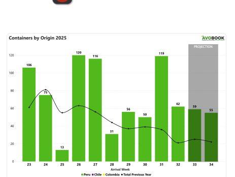 En la semana 32, el mercado chino recibió 62 contenedores de aguacate provenientes de Perú, lo que representa una reducción cercana al 50 % en comparación con la semana anterior. Aun así, el volumen continúa siendo superior al registrado en el mismo periodo del año pasado.