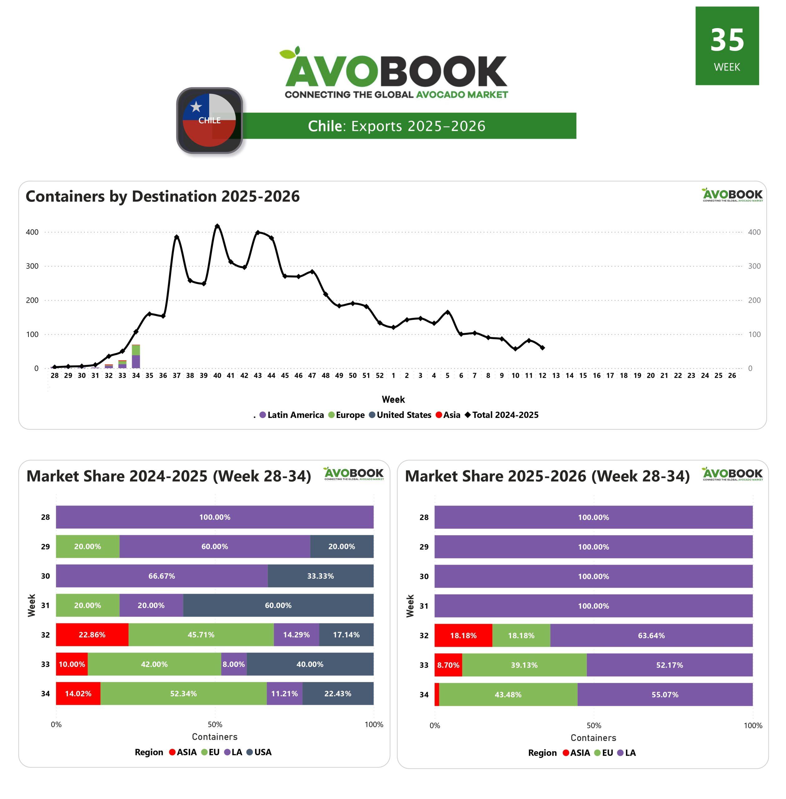 La temporada chilena de aguacate comienza a tomar impulso. En la semana 34 se estima que salieron 69 contenedores, una cifra que triplica los 23 embarcados en la semana anterior. Sin embargo, el volumen aún se mantiene un 36% por debajo del registrado en la misma semana de 2024, lo que refleja un arranque más moderado que el del año pasado.
