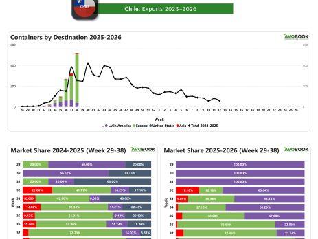 Chile cerró la semana 38 con 521 embarques de aguacate Hass, de los cuales el 91% tuvo como destino Europa, el 2% se dirigió a Asia y el 7% a mercados de Latinoamérica. Este patrón confirma el desplazamiento de Europa como destino principal por sobre Latinoamérica, que en semanas previas ocupaba un lugar más relevante en las exportaciones chilenas.