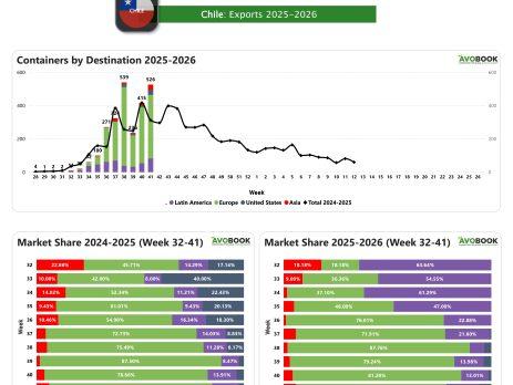 El aguacate chileno continúa ganando impulso en el mercado internacional. En la semana 42, el país registró un volumen de aproximadamente 526 contenedores exportados, cifra considerada alta y superior a las expectativas iniciales. Este nivel representa un incremento del 27% respecto a la semana anterior y un 69% más que en el mismo periodo del año pasado, reflejando una temporada de notable dinamismo.
