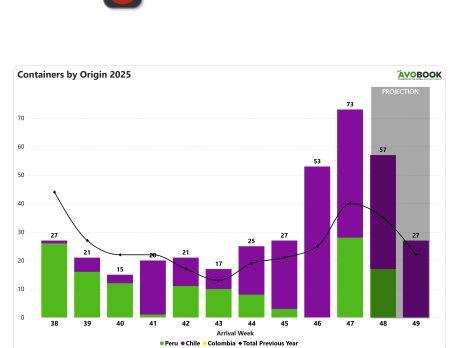 El mercado chino registró en la semana 47 un total de 73 contenedores de aguacate procedentes de Perú y Chile. Esta cifra representa un incremento del 38% en comparación con la semana anterior y un aumento interanual del 83%. El principal origen fue Chile, que concentró el 62% del total, mientras que Perú aportó el 38% restante.