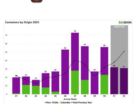 La composición del suministro revela un liderazgo claro de Chile, que aporta el 58% de los volúmenes, seguido por Perú con un 40%. México, por su parte, inicia tímidamente su participación con un envío puntual, aunque su presencia podría repetirse en las próximas semanas, probablemente en cifras moderadas.