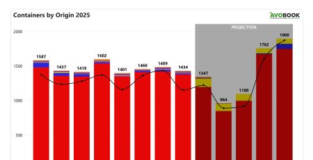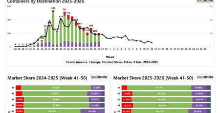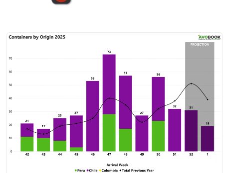 La composición de los orígenes muestra una fuerte concentración. En esta semana no se observan arribos desde Perú y la oferta proviene casi exclusivamente desde Chile, que concentra el 97% del volumen. México participa de forma marginal con un 3%, equivalente a un solo embarque. Si bien existe algo de presencia mexicana, el comportamiento refleja una marcada intermitencia, mientras que Chile mantiene volúmenes muy similares a los registrados la semana anterior, consolidándose como el principal abastecedor en este período.