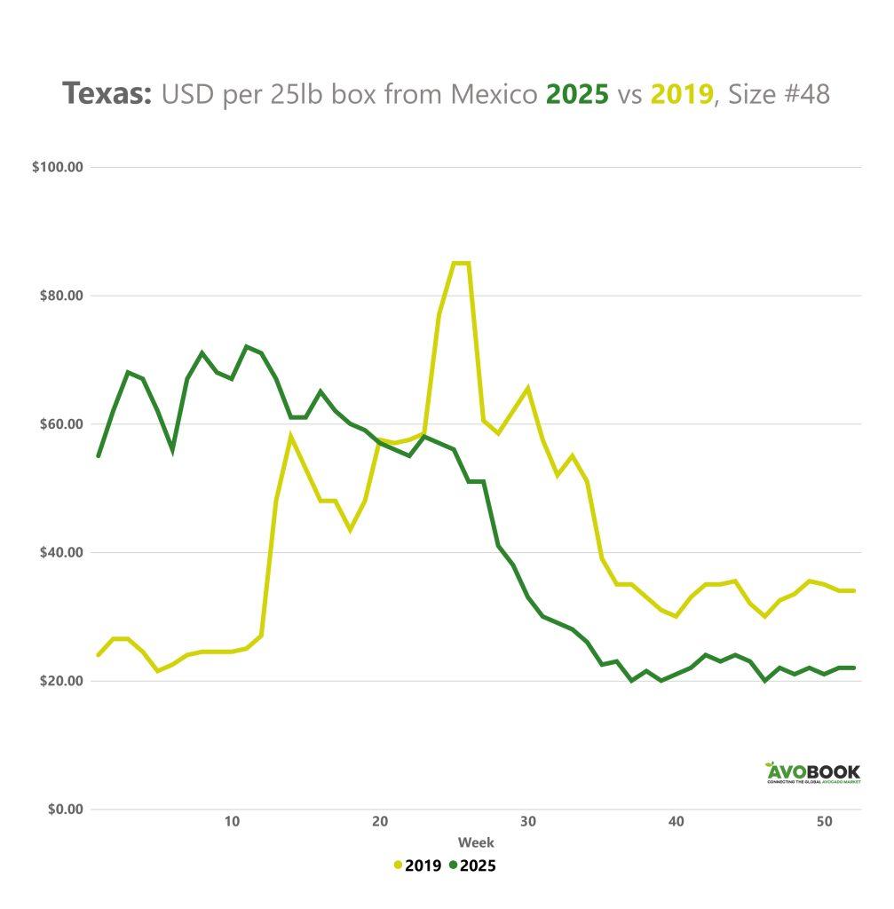 La comparación entre los precios de 2025 y 2019 para el calibre 48 en Texas revela un cambio profundo en la dinámica del mercado. En temporadas anteriores, como 2019, el comportamiento era relativamente predecible: los precios alcanzaban su punto máximo hacia la mitad del año, coincidiendo con la transición entre campañas, para luego ajustarse gradualmente.