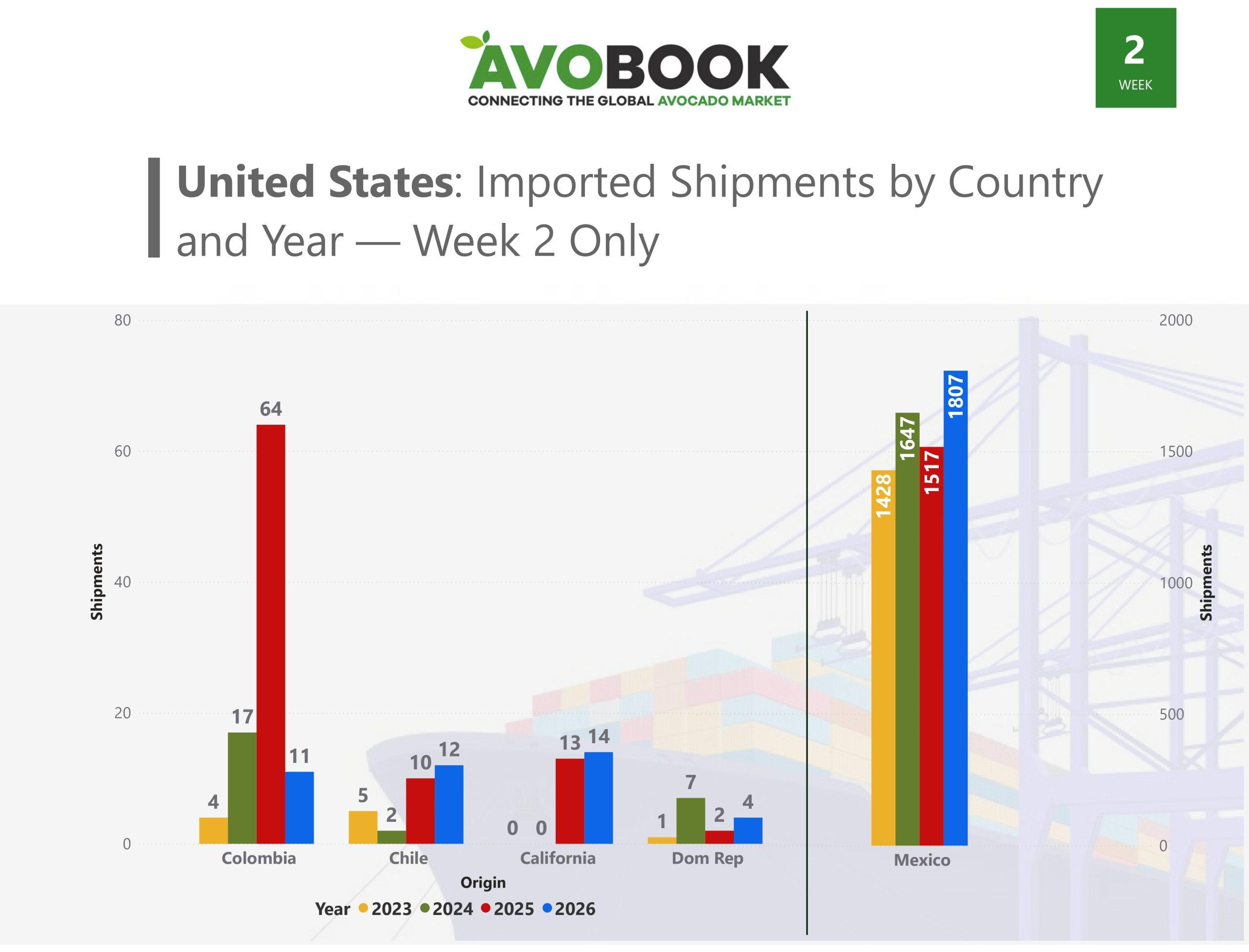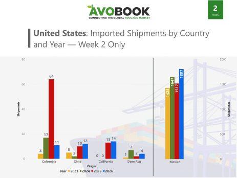 Durante la semana 2 de 2026, el mercado estadounidense del aguacate volvió a confirmar la fuerte dependencia de México como principal proveedor, en un escenario marcado por altos volúmenes, tensiones operativas y una demanda que sorprendió por su solidez tras el periodo festivo. El análisis de los datos de Avobook, junto con la lectura de industria que entrega Sergio Paz, gerente general de Coliman Avocados, permite observar cómo se ha configurado esta semana clave en comparación con los últimos cuatro años.