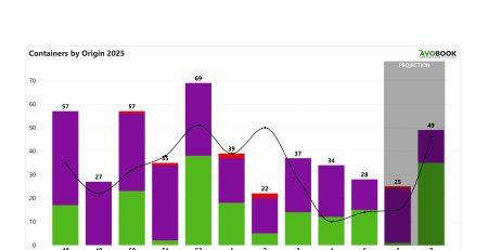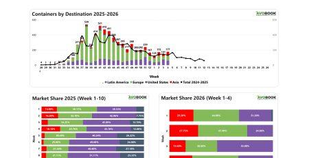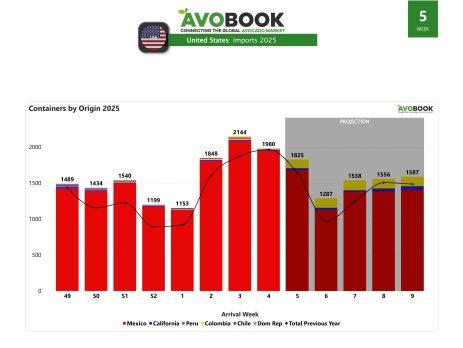 El mercado europeo cerró la semana 5 con 644 embarques, un nivel similar al de la semana anterior, con una baja de 1%, y un 2% por debajo del volumen registrado en la misma semana de 2025. La oferta se distribuyó principalmente entre Israel, con un 33% del total, seguido por España con 28%, Colombia con 17%, Marruecos con 11%, Chile con un 9%, mientras que México y Perú con cerca de un 2% cada uno.