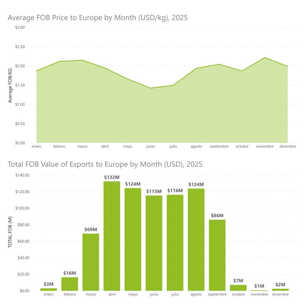 En términos de valor total exportado, abril marcó el punto máximo de la temporada con aproximadamente US$132 millones en exportaciones FOB hacia Europa. Mayo y agosto también registraron cifras elevadas, con alrededor de US$124 millones cada uno, mientras que junio y julio se mantuvieron sobre los US$115 millones. A partir de septiembre se produjo una caída a US$86 millones, en línea con la reducción progresiva del volumen exportado. En los últimos meses del año, con la campaña prácticamente cerrada, los montos descendieron a niveles significativamente menores.