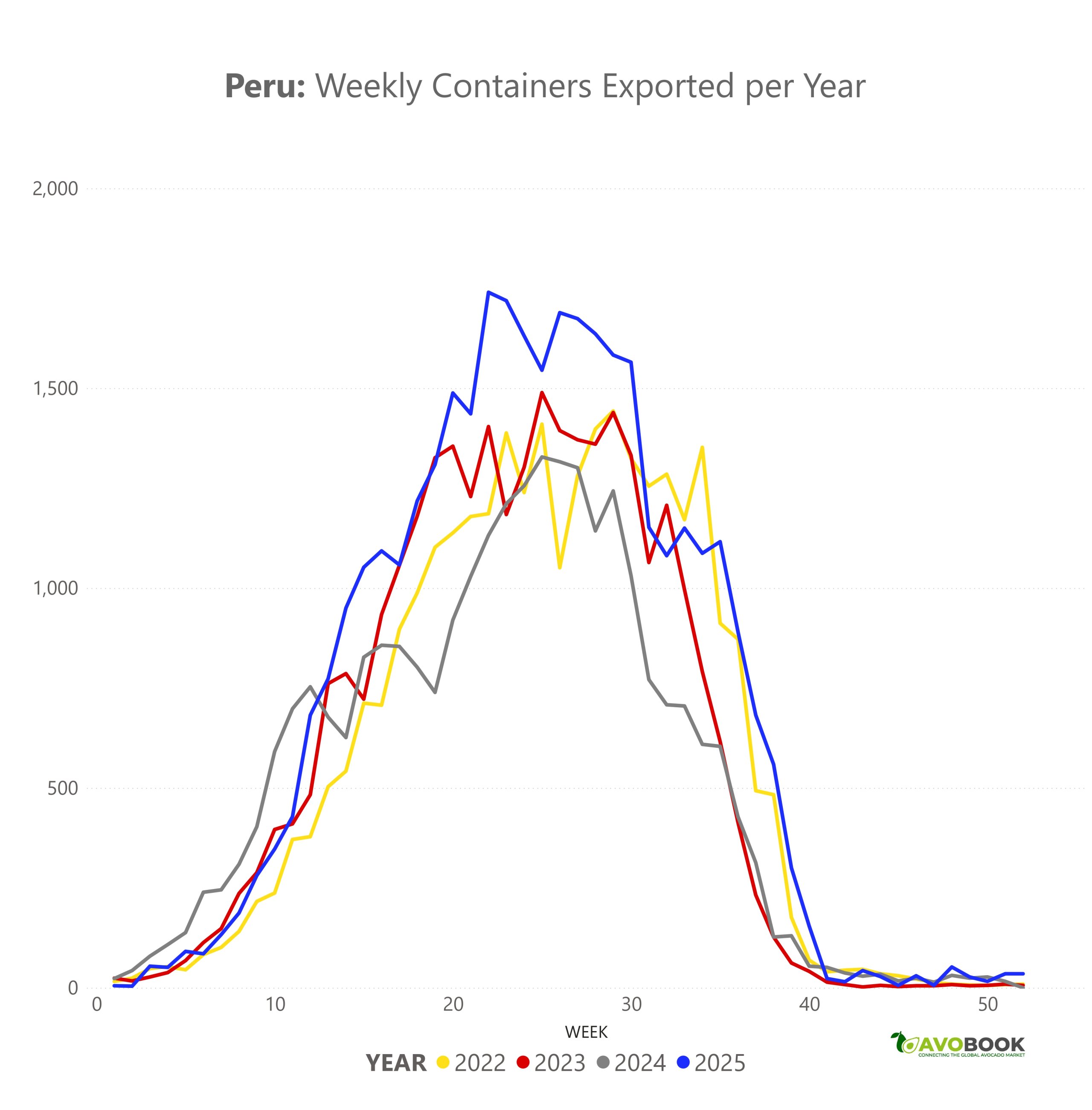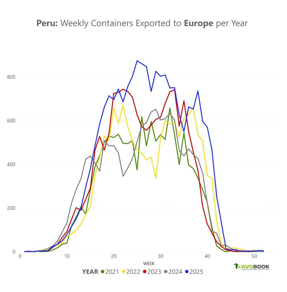 Este nivel alto se mantiene durante buena parte del invierno del hemisferio sur, para luego descender progresivamente a medida que se acerca la semana 40. En las semanas previas a ese hito, los despachos ya bajan de los 500 contenedores semanales y, tras la semana 40, el volumen es mínimo, prácticamente inexistente. Este patrón define con claridad la ventana principal de Perú en el mercado internacional.
