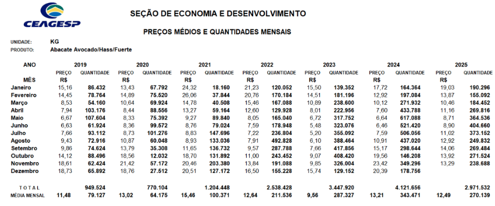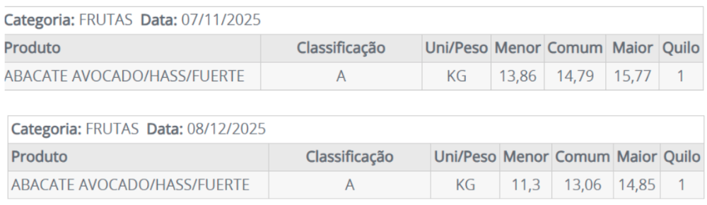 El precio del aguacate Hass (Avocado) actual en la central de abastecimiento, CEAGESP (https://ceagesp.gov.br/cotacoes/) referente el día 8/12, está más bajo que Noviembre (USD 2,20/kg a 2,85/kg). No creo que el precio deba subir más, pues en Enero ya empiezan a poner fruta sin materia seca en el mercado…