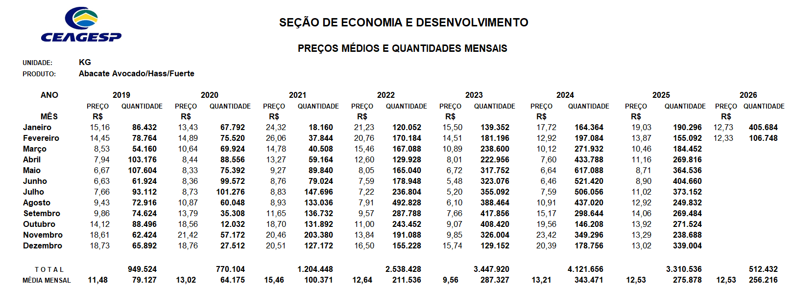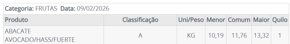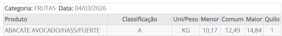 El precio del aguacate Hass (Avocado) actual en la central de abastecimiento, CEAGESP