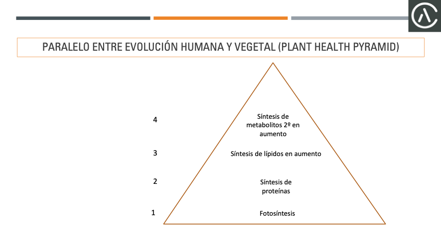 Tal como Maslow desarrolló lo anterior, el agrónomo regenerativo estadounidense John Kempf elaboró la Pirámide de Salud Vegetal, compuesta por 4 niveles de desarrollo, tal como se describe en la gráfica siguiente: