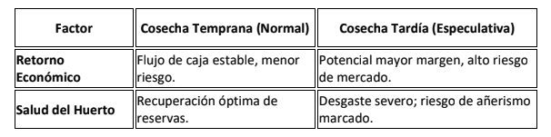 - Desventaja Fisiológica: La fruta actúa como un "sumidero" (sink) masivo de carbohidratos y minerales. Mientras más tiempo pase la fruta en la rama, más agota las reservas de la planta, compitiendo directamente con el desarrollo de los brotes de verano y la inducción floral de la temporada siguiente.