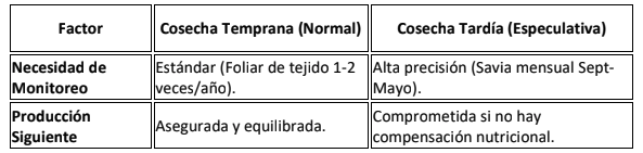 Conclusión: Retrasar la cosecha en Chile es una herramienta válida, pero sin un monitoreo nutricional de alta precisión, lo que se gana en precio este año lo podría perder (con creces) en kilos la temporada siguiente. La clave es "alimentar la fruta vieja sin dejar de nutrir al árbol pensando en la nueva flor".
