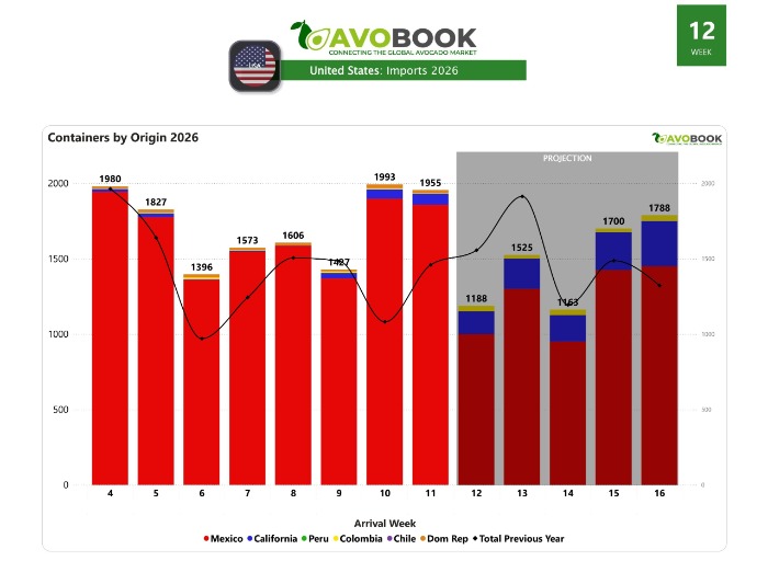 Al cierre de la semana 11 registra 1.954 llegadas en EE.UU., con dominio de México, alza en California y estabilidad de precios tras semanas de incremento.