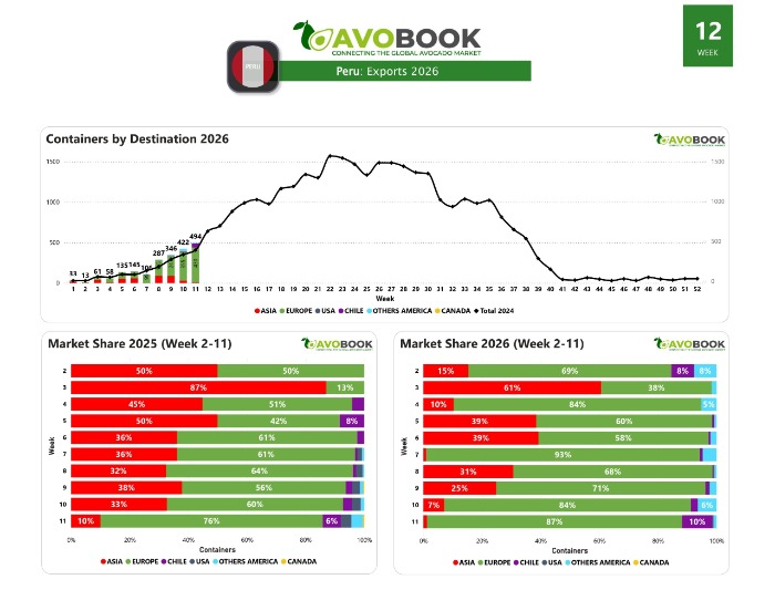 Perú alcanza 494 envíos al cierre de la semana 11, con 87% dirigido a Europa, consolidando su posición como principal proveedor y en plena fase de crecimiento.