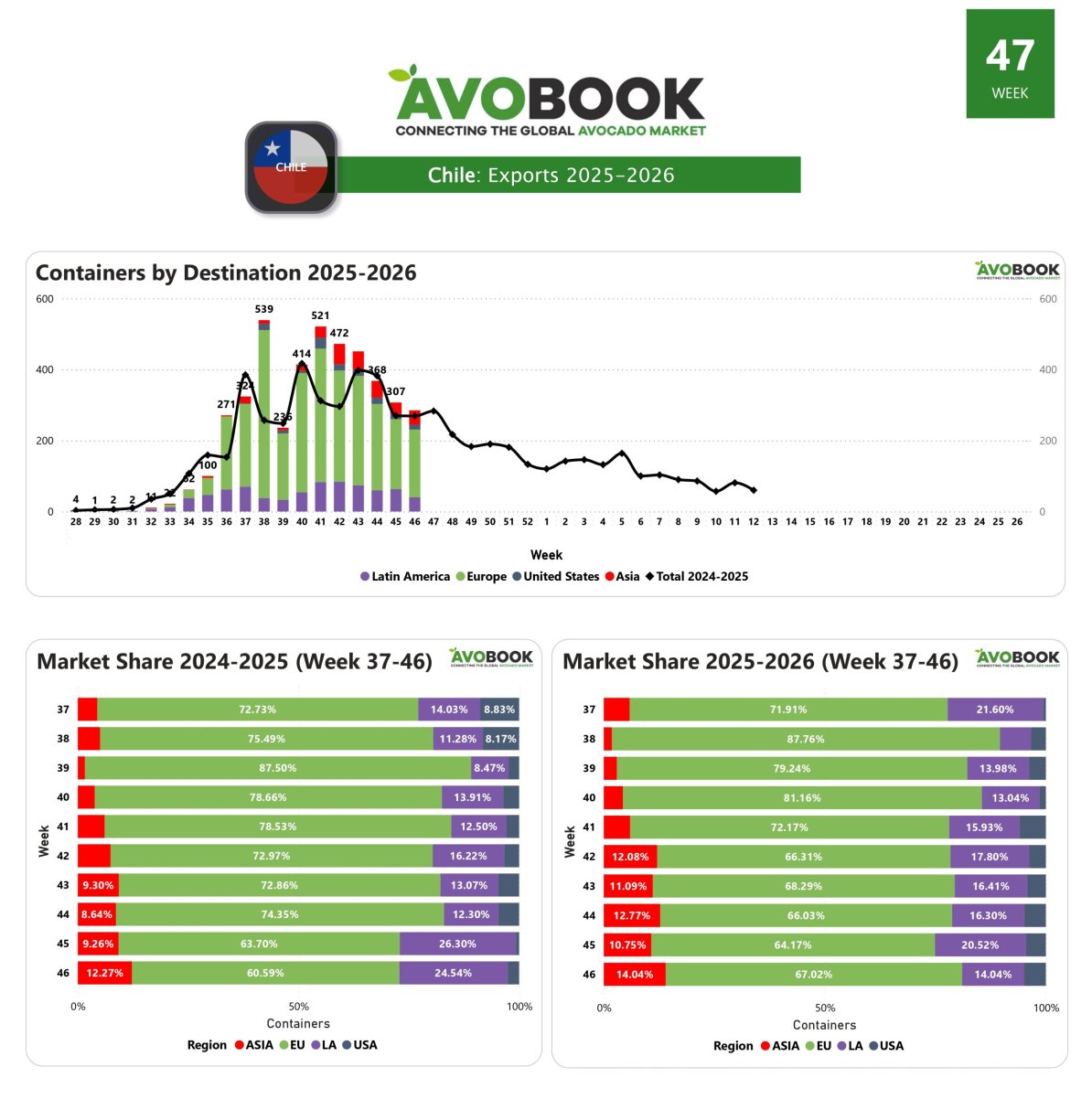 En términos de participación, Chile continúa mostrando una presencia relevante en el mercado europeo, donde alcanzó un 49% durante la semana 47. En el mercado chino, su participación llegó al 62%, consolidando su posición como uno de los principales abastecedores. En contraste, en Estados Unidos su peso se mantiene por debajo del 1%, lo que refleja un rol marginal en ese destino.