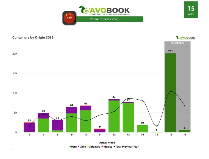 In week 15, the avocado market in China recorded only one shipment, a figure that does not reflect the true dynamics of shipments due to the intermittent nature of deliveries from Peru. This variation is due to logistical adjustments that can concentrate volumes in previous or subsequent weeks, thus limiting the weekly data as an indicator of actual flow.