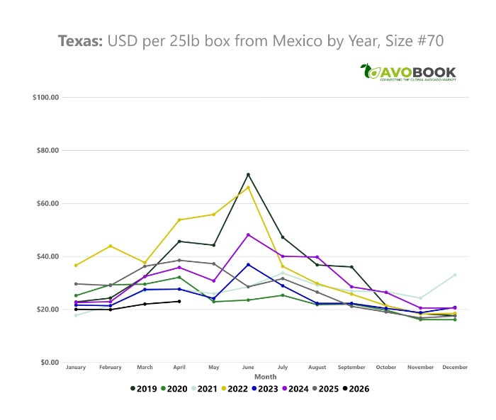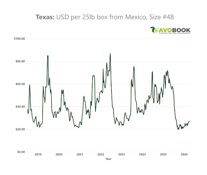 According to Avobook's data team, during February and March of 2026, prices in the US market—specifically in Texas for Mexican fruit—remained low, near their historical lows. This situation was observed in sizes such as #48 and #70, with values considerably lower than those recorded during the same period between 2022 and 2024, years in which the market showed significantly higher prices.