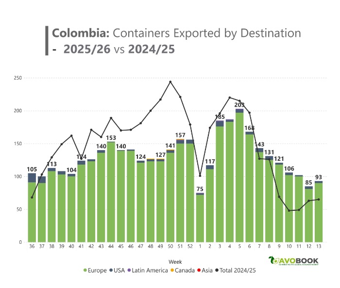 In terms of destinations, the 2025/26 season was marked by a strong concentration in Europe. Approximately 96% of Colombian avocados were destined for this market. The United States accounted for about 3% of shipments, while Canada received less than 1%, with only isolated shipments. Latin America also appears with a practically marginal share of total exports.