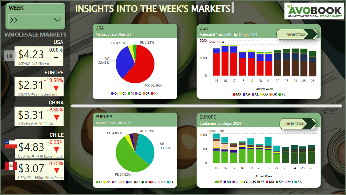 Colombia y Perú ganan terreno en las góndolas, pese a disminuir levemente sus envíos, con un 4% y un 3% de participación, respectivamente. El aguacate peruano venía con volúmenes fuertes, por lo que el 30% de reducción semanal en envíos, responde a una normalización de sus números en el mercado norteamericano.