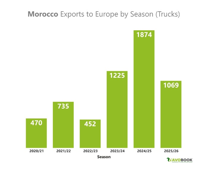 La evolución de los envíos en los últimos años evidencia variaciones relevantes entre campañas. De acuerdo con el equipo de data de Avobook, las exportaciones de Marruecos hacia Europa han mostrado un comportamiento con cambios interanuales, con un crecimiento entre 2020/21 y 2021/22, una caída en 2022/23, una recuperación que culmina en el peak de 2024/25 y una nueva disminución en 2025/26. Este patrón refleja fluctuaciones en los volúmenes exportados a lo largo del tiempo.