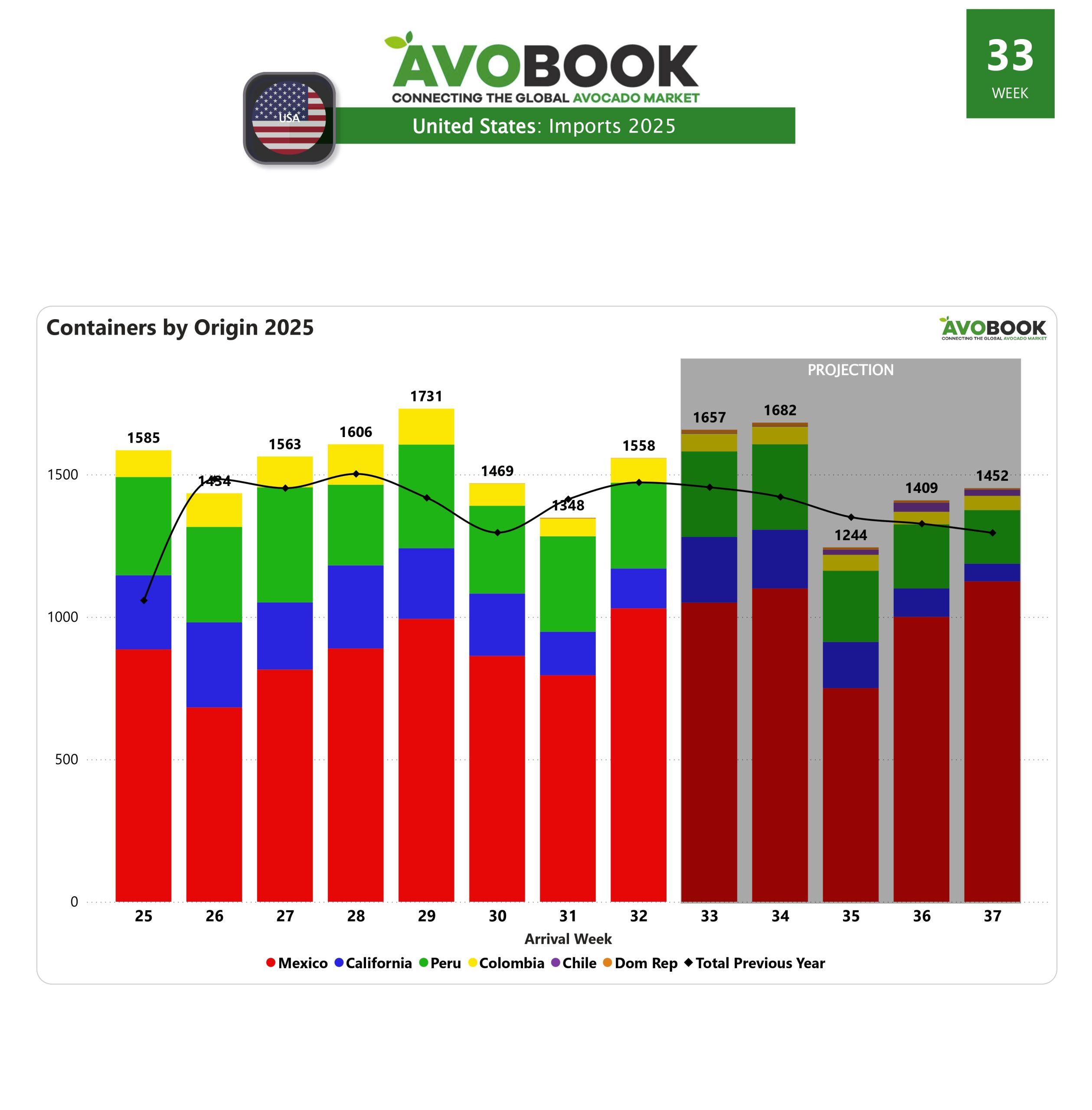 El mercado de Estados Unidos registró durante el cierre de la 32 la llegada de 1.558 envíos de aguacates, cifra que representa un aumento del 16% respecto a la semana anterior y un 6% más en comparación con igual periodo del año pasado. México concentró dos tercios de la oferta, mientras que Perú aportó un 19%, California un 9% y Colombia un 6%.