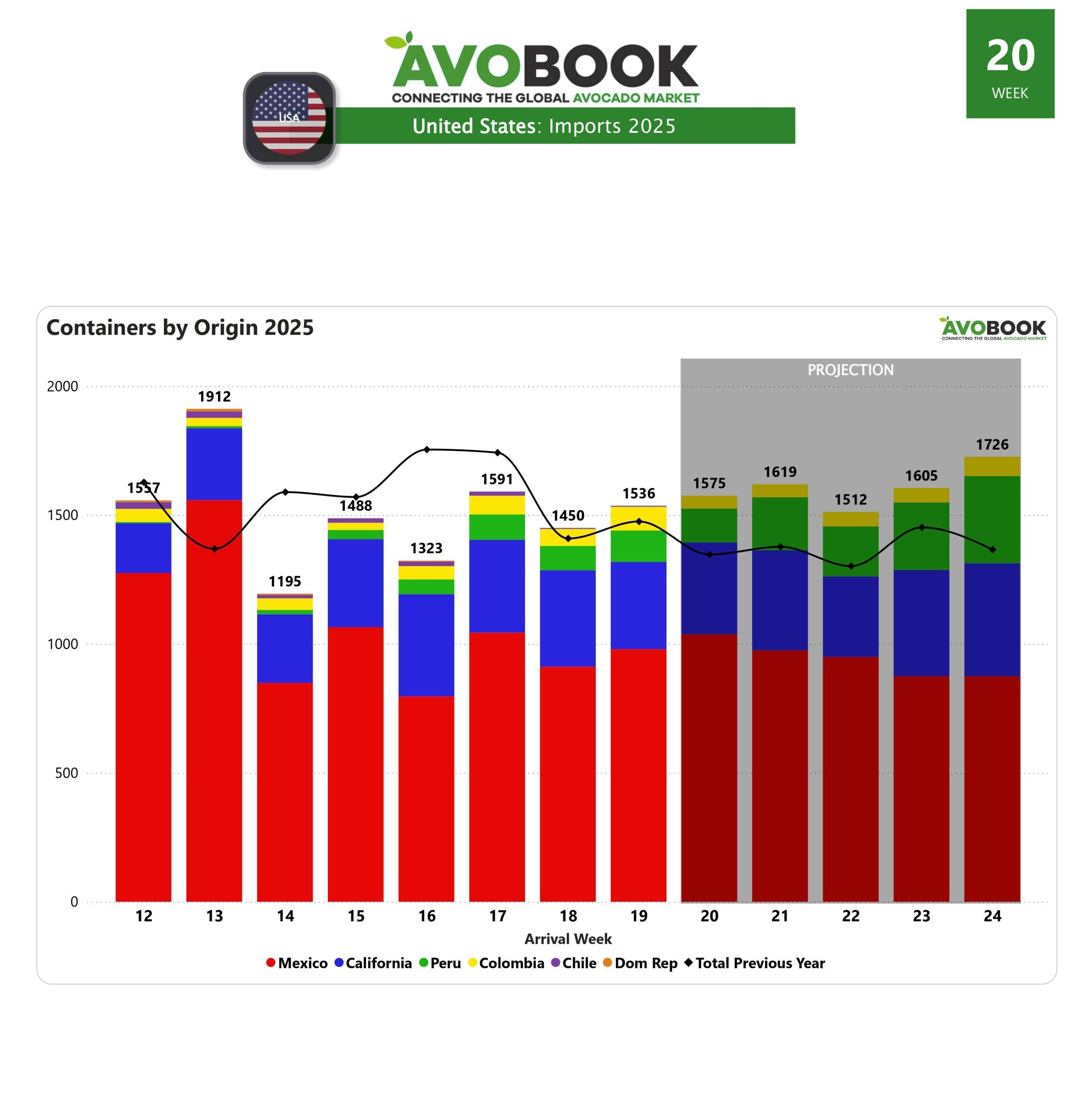 México sigue dominando el escenario con el 64% del mercado estadounidense, manteniéndose como el principal proveedor. Le siguen California con un 22%, Perú con 8% y Colombia con un 6%. Aunque el liderazgo de México se mantiene firme, los movimientos más llamativos provinieron del sur del continente: Perú incrementó su volumen en un 30% de una semana a otra, al igual que Colombia, que también subió un 39%. En comparación, el aumento de México fue más moderado, con un 7%, mientras que California registró una baja del 10%, sintiendo la presión de sus competidores.