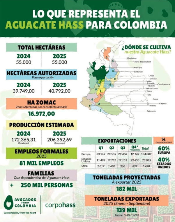 Las cifras reflejan la consolidación del aguacate Hass como un producto clave de exportación. Para 2025, las toneladas proyectadas a exportar ascienden a 182.000, mientras que entre enero y septiembre ya se habían registrado 139.000 toneladas exportadas, según la fuente DIAN / SIICEX.