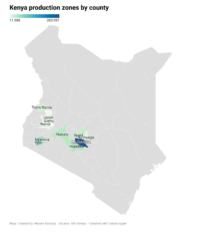 El condado de Murang’a lidera la producción con más de 200.991 TM, gracias a huertos consolidados, altitudes favorables y una sólida organización de pequeños agricultores. Otras zonas destacadas son Kisii (74.904 TM), Kiambu (44.559 TM), Nakuru (39.484 TM) y Nyeri (33.556 TM), mientras que regiones como Trans Nzoia, Kirinyaga, Nyamira, Nandi y Uasin Gishu aportan entre 12.000 y 27.000 TM cada una.