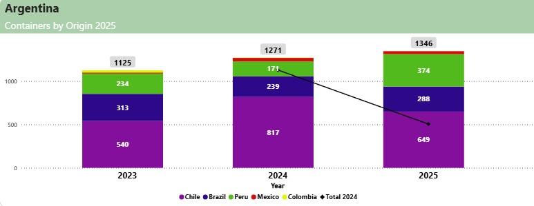 El crecimiento argentino no solo se explica en los volúmenes, sino también en los cambios en la participación de los países exportadores. Chile se mantiene como el principal abastecedor, con 817 contenedores en 2024 y 649 en 2025, aunque con un descenso que abrió espacio a otros actores. Perú mostró un salto significativo al duplicar sus exportaciones en 2025, alcanzando 374 contenedores frente a los 182 del año anterior. Brasil también consolidó su rol, pasando de 239 a 288.