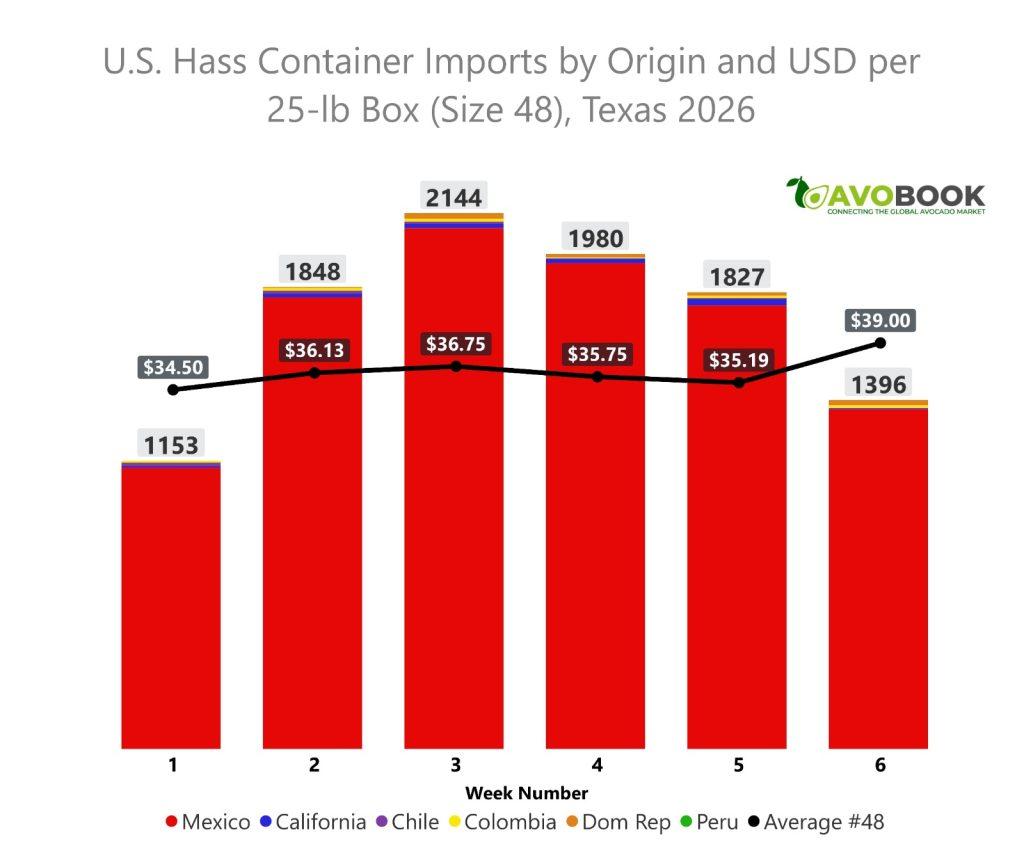 Sin embargo, la caída en volumen registrada en la semana 6 generó una reacción inmediata en el mercado, elevando el precio promedio hasta USD 39,00 por caja, el nivel más alto del período analizado. El movimiento confirma la estrecha relación entre oferta y precio en el mercado estadounidense, especialmente tras una ventana de consumo extraordinaria.