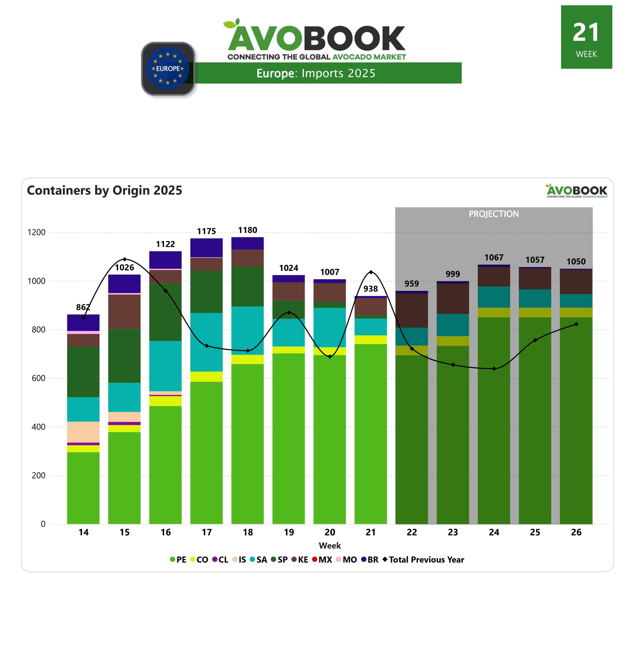 Durante la semana 21, el mercado europeo de aguacate registró un total de 935 embarques, marcando una caída del 7 % respecto a la semana anterior y un retroceso del 10 % frente al mismo periodo del año pasado. Este descenso sitúa el flujo semanal por debajo de los 1.000 embarques, reflejando un ritmo más contenido en la actividad comercial del continente.