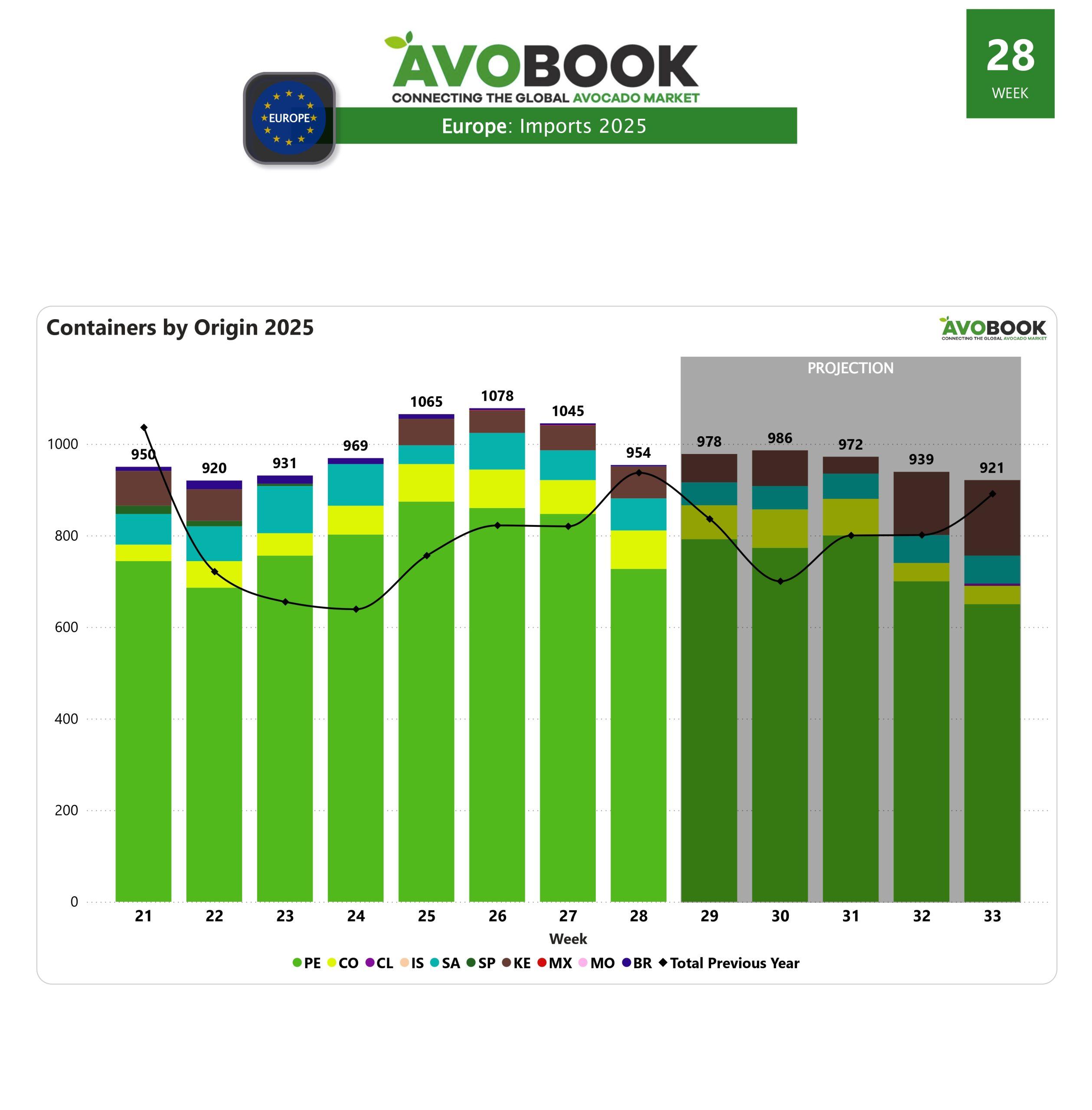 El mercado europeo experimentó una disminución del 9% en su volumen de importaciones, con un total estimado de 954 contenedores. Esta cifra marca una baja respecto al umbral habitual de los 1.000 contenedores semanales, aunque se mantiene apenas un 2% por encima del volumen registrado en la misma semana del año anterior.