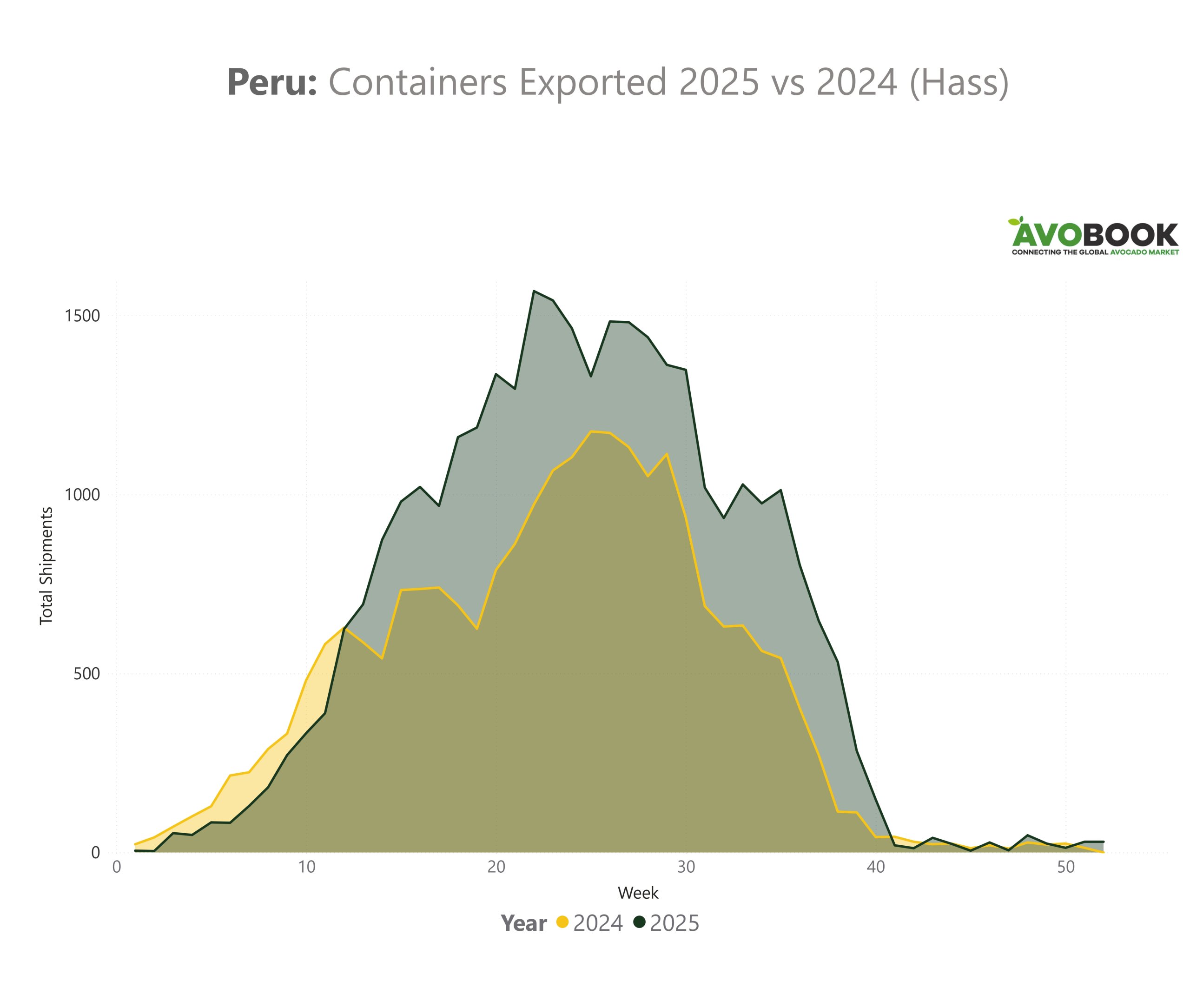 La campaña 2025 de la palta Hass peruana marcó una recuperación significativa tras el retroceso observado en 2024. Según el reporte oficial de ProHass, entre las semanas 01 y 52 de 2025 Perú exportó 32.700 contenedores, equivalentes a 722.754 toneladas métricas, frente a 23.747 contenedores y 523.035 toneladas métricas del año anterior. En términos interanuales, esto representó un crecimiento cercano al 38%, tanto en volumen como en toneladas.