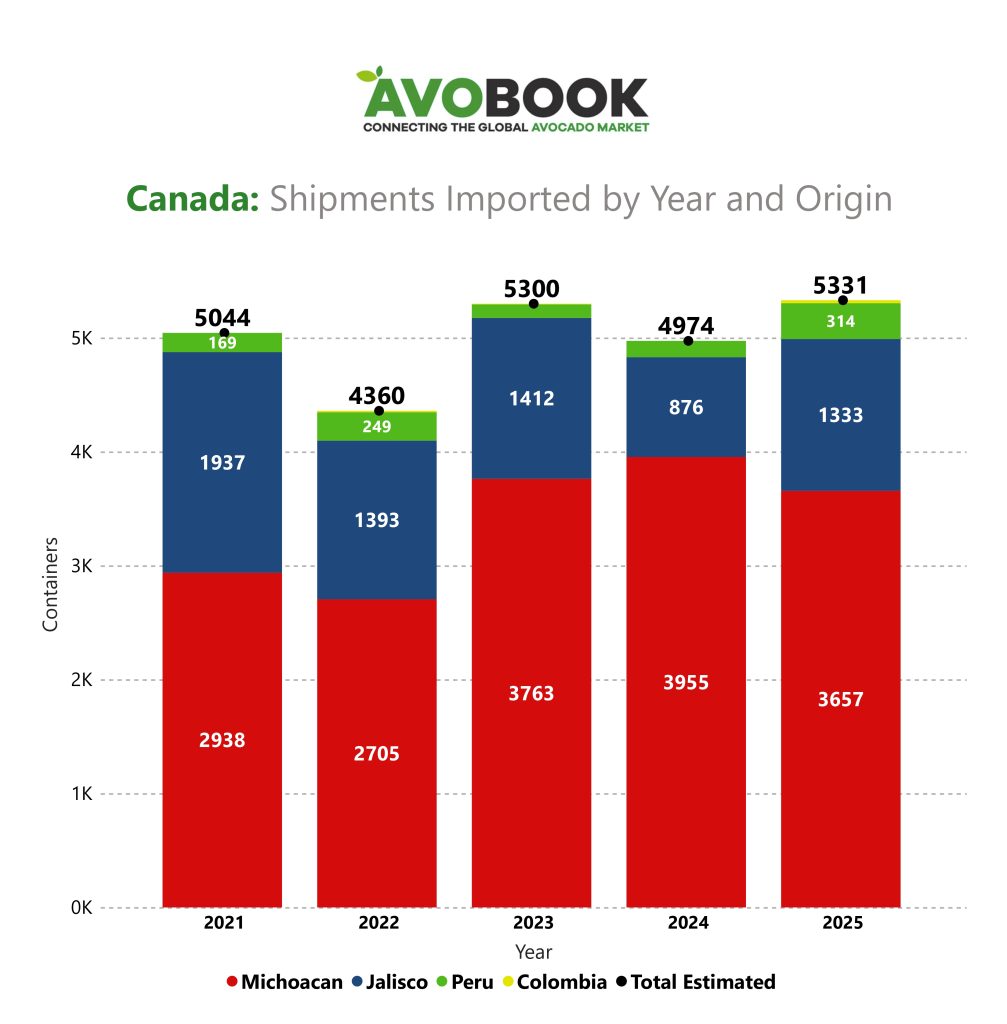 Con un nuevo récord histórico de importaciones, el mercado canadiense de aguacate confirma en 2025 su alto nivel de dependencia de México, especialmente de Michoacán, mientras Jalisco recupera participación y Perú fortalece gradualmente su rol como tercer proveedor, en una estructura de abastecimiento que mantiene fuertes similitudes con el máximo alcanzado en 2023.