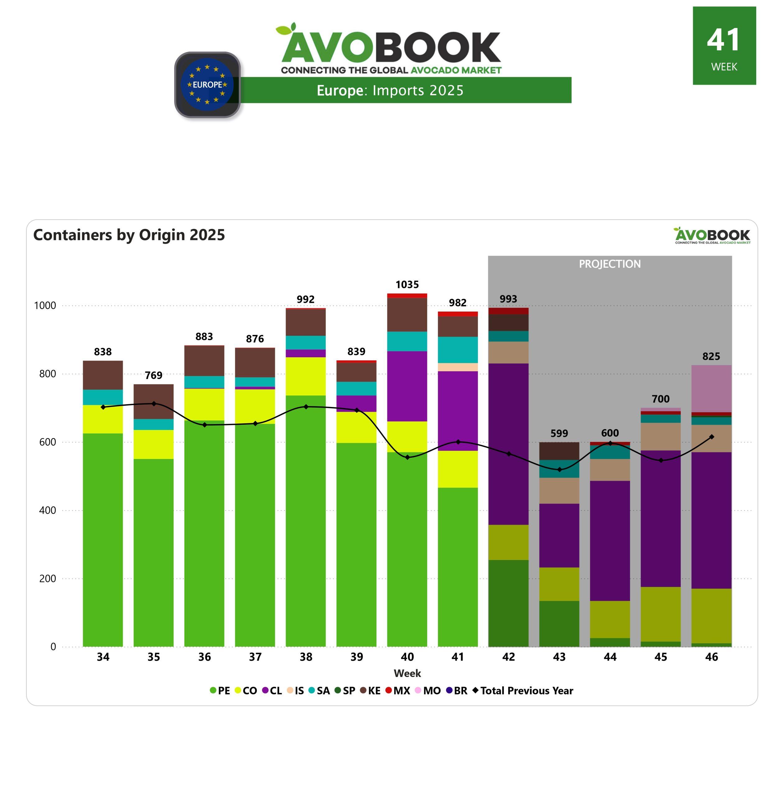El mercado europeo cerró la semana 41 con un total de 958 llegadas, lo que representa una disminución del 7% respecto al volumen de la semana anterior. Aun así, el flujo de fruta se mantiene 60% por encima de lo registrado en el mismo periodo del año pasado, reflejando la solidez del consumo en el continente incluso en una fase de transición entre orígenes y proveedores.