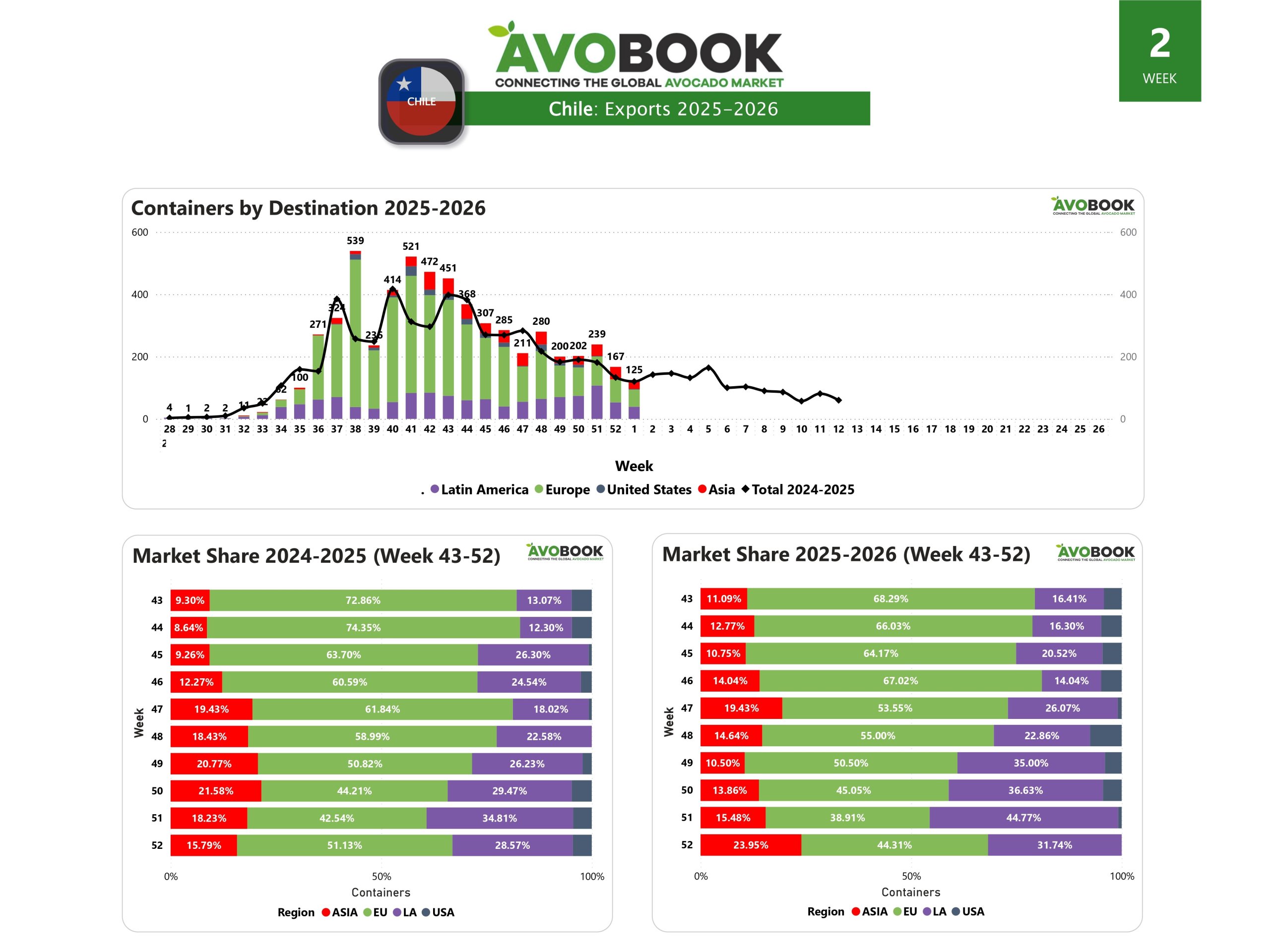 En el acumulado de la temporada, la participación del continente asiático se ha mantenido estable. En contraste, Europa ha incrementado su recepción de fruta, Latinoamérica ha reducido levemente sus volúmenes, y Estados Unidos ha registrado la caída más marcada. Este mercado pasó de recibir 9% de los envíos en la temporada anterior a 3% en la actual, completando dos semanas consecutivas de disminución en los despachos desde Chile.