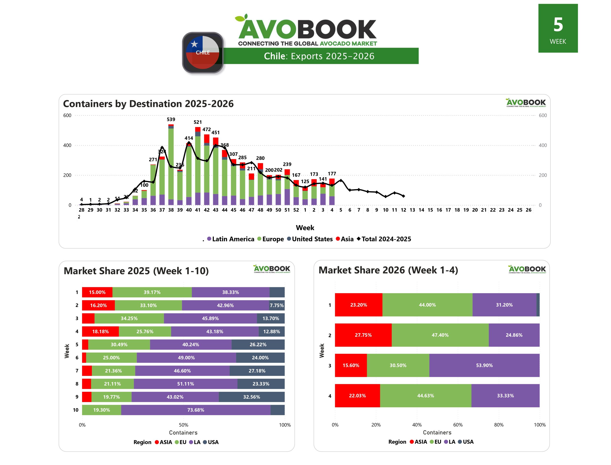 En la semana 5, Chile mantiene una participación cercana al 9% en el mercado europeo y concentra la totalidad de la oferta en China. En contraste, no se registran envíos hacia Estados Unidos, mercado que deja de figurar entre los destinos activos en el período analizado.