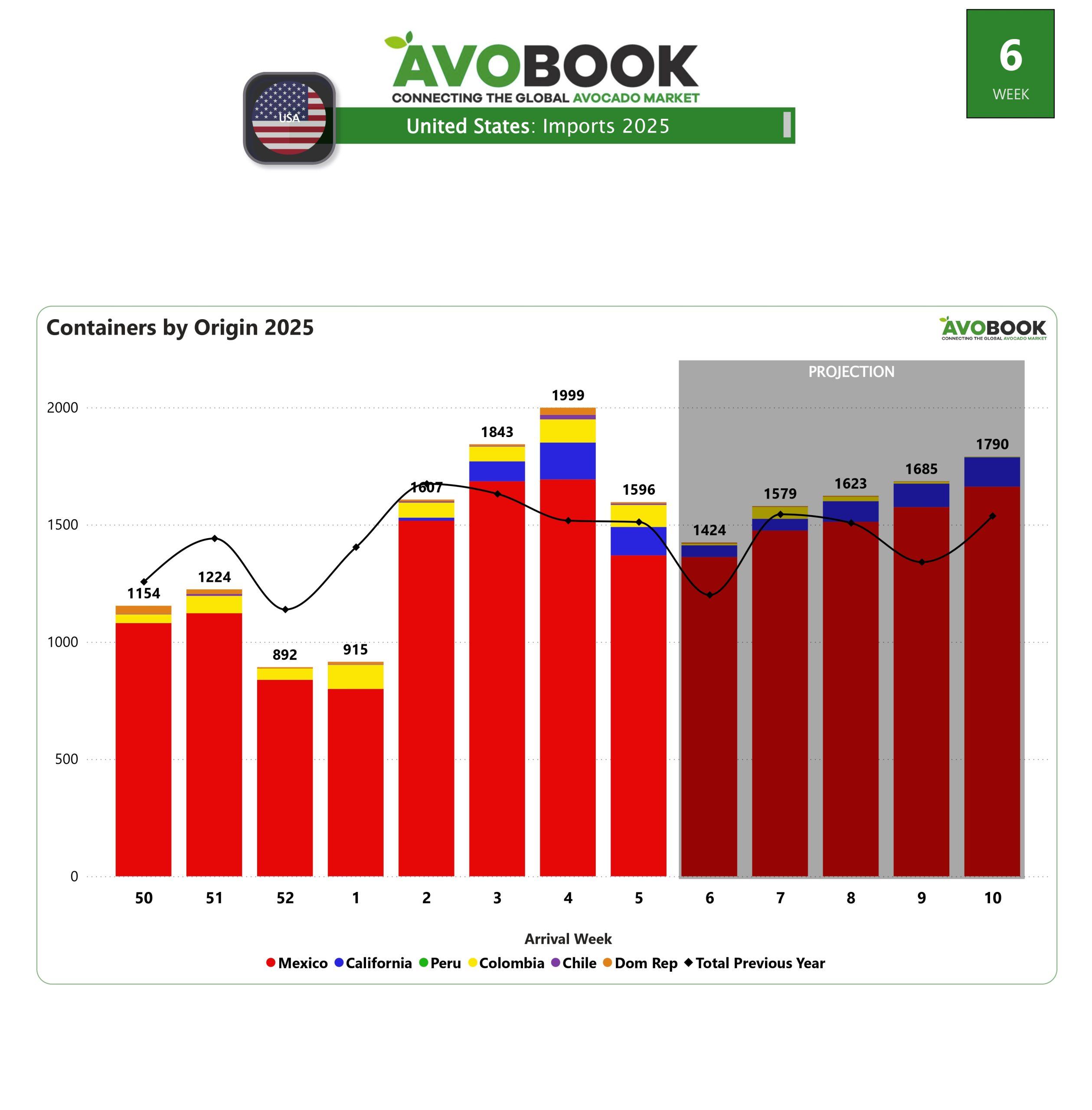 El mercado del aguacate en Estados Unidos cerró la semana 5 con una notable reducción en el volumen de importaciones. En total, se recibieron aproximadamente 1,600 contenedores, de los cuales el 86% provino de México, el 8% de California y el 6% de Colombia.