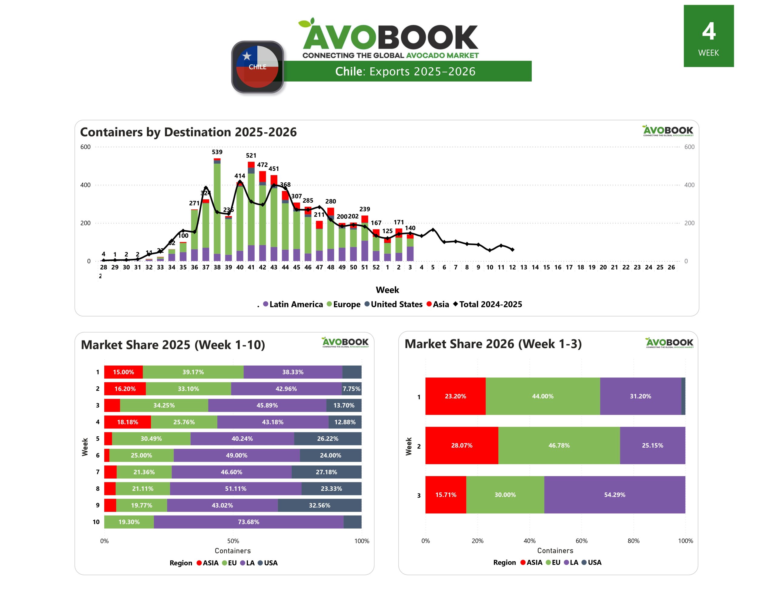 La distribución de los destinos refleja un claro enfoque regional. Latinoamérica concentra el 54 % de los envíos, posicionándose como el principal mercado, seguida por Europa con un 30 % y Asia con un 16 %. En esta semana no se registra participación hacia Estados Unidos, marcando un cambio relevante en la composición de los destinos frente a etapas anteriores de la temporada.