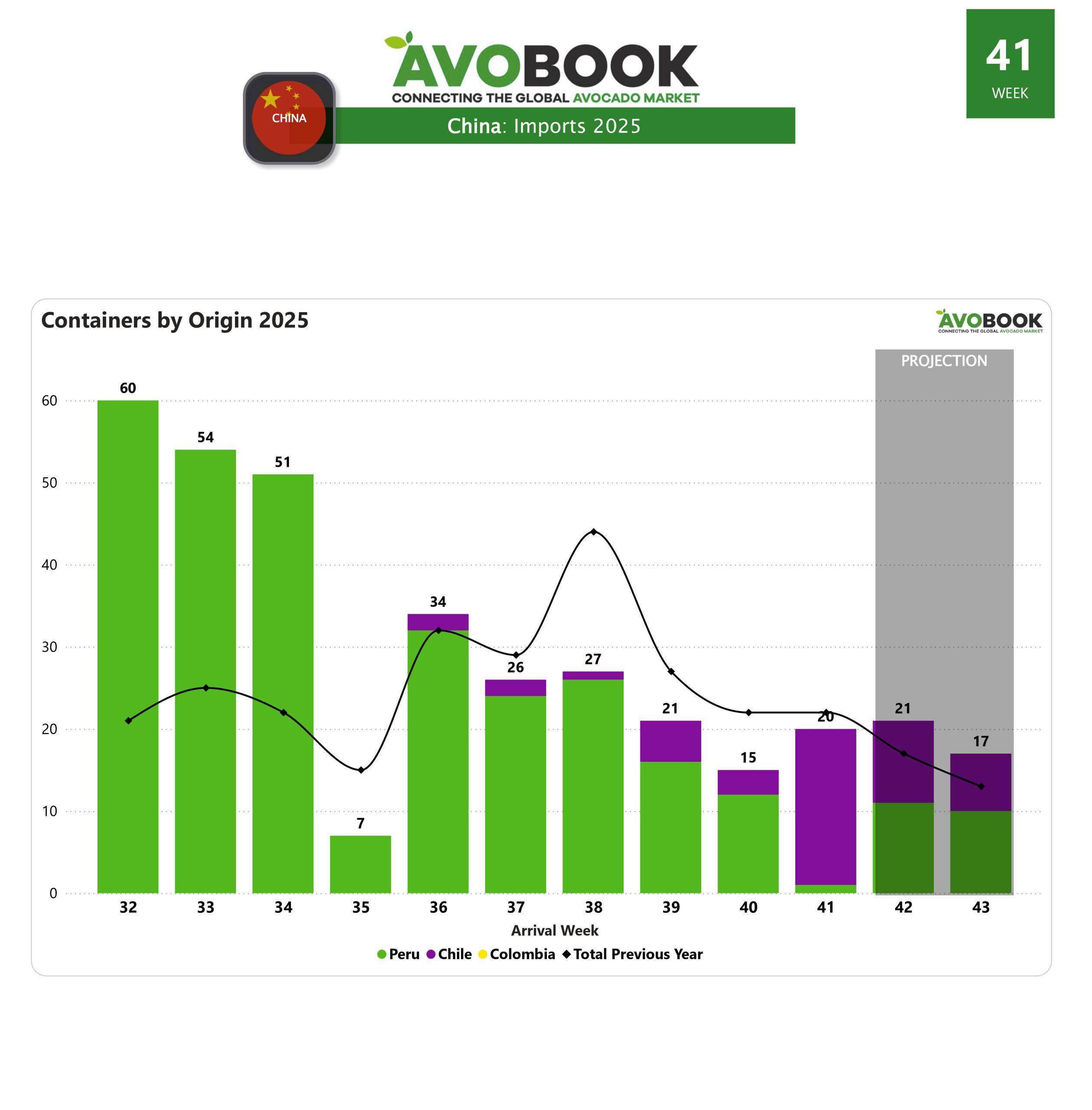 El mercado chino del aguacate mostró una reactivación moderada durante la semana 41, registrando un total de 20 contenedores, de los cuales 19 procedieron desde Chile y uno desde Perú. Esto representa un incremento del 33% respecto a la semana anterior, aunque todavía un 9% por debajo del volumen registrado en el mismo periodo del año pasado. Con estas cifras, Chile logra dominar por primera vez en la temporada 2025/26 el mercado chino, alcanzando el 95% de participación.