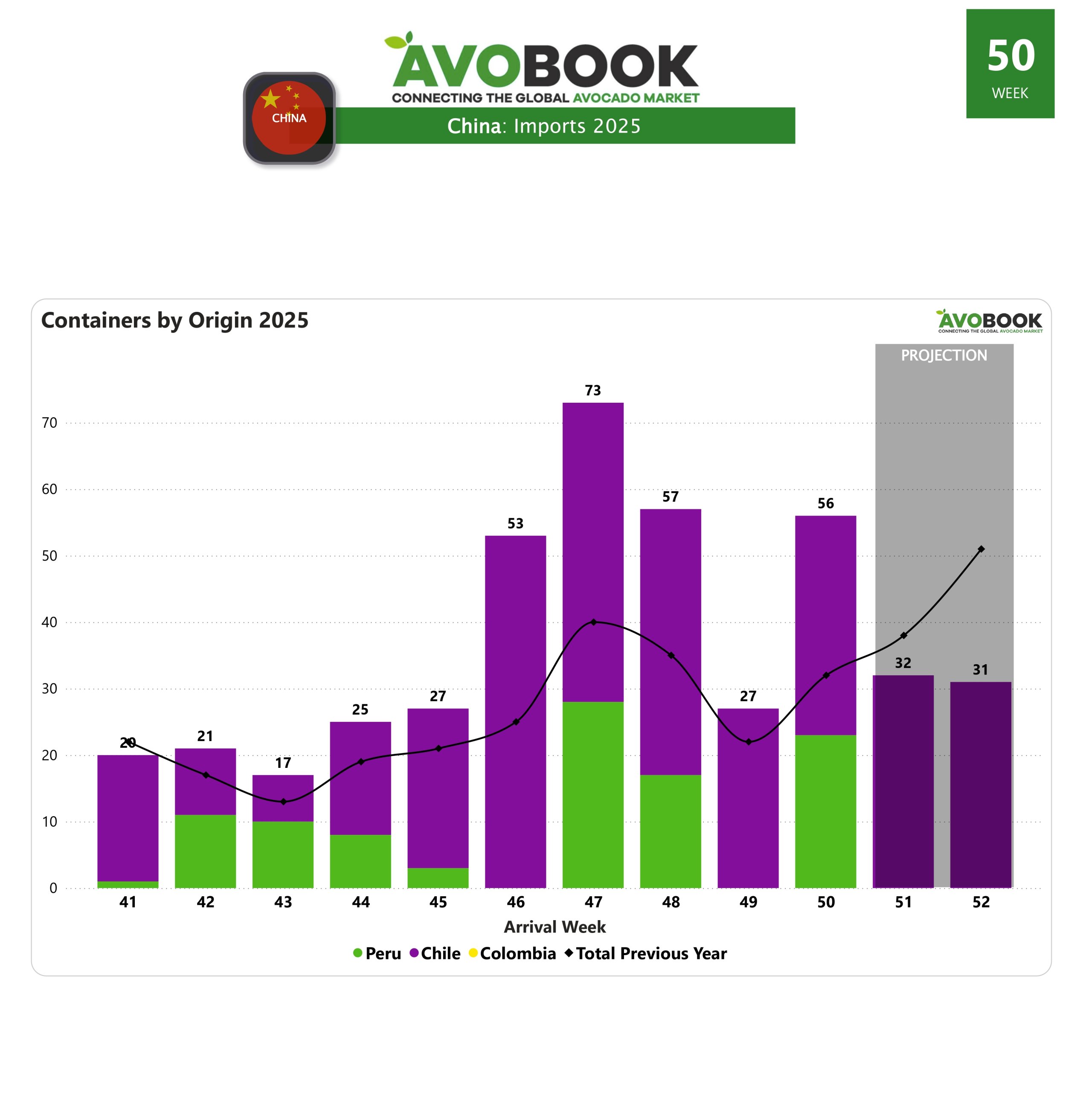 El mercado chino mostró un cambio significativo en su dinámica durante la semana 50, impulsado por un crecimiento notable en la oferta. Las llegadas alcanzaron 57 contenedores, más del doble de lo registrado la semana anterior, configurando un escenario de mayor disponibilidad que comienza a influir en el comportamiento de los precios.