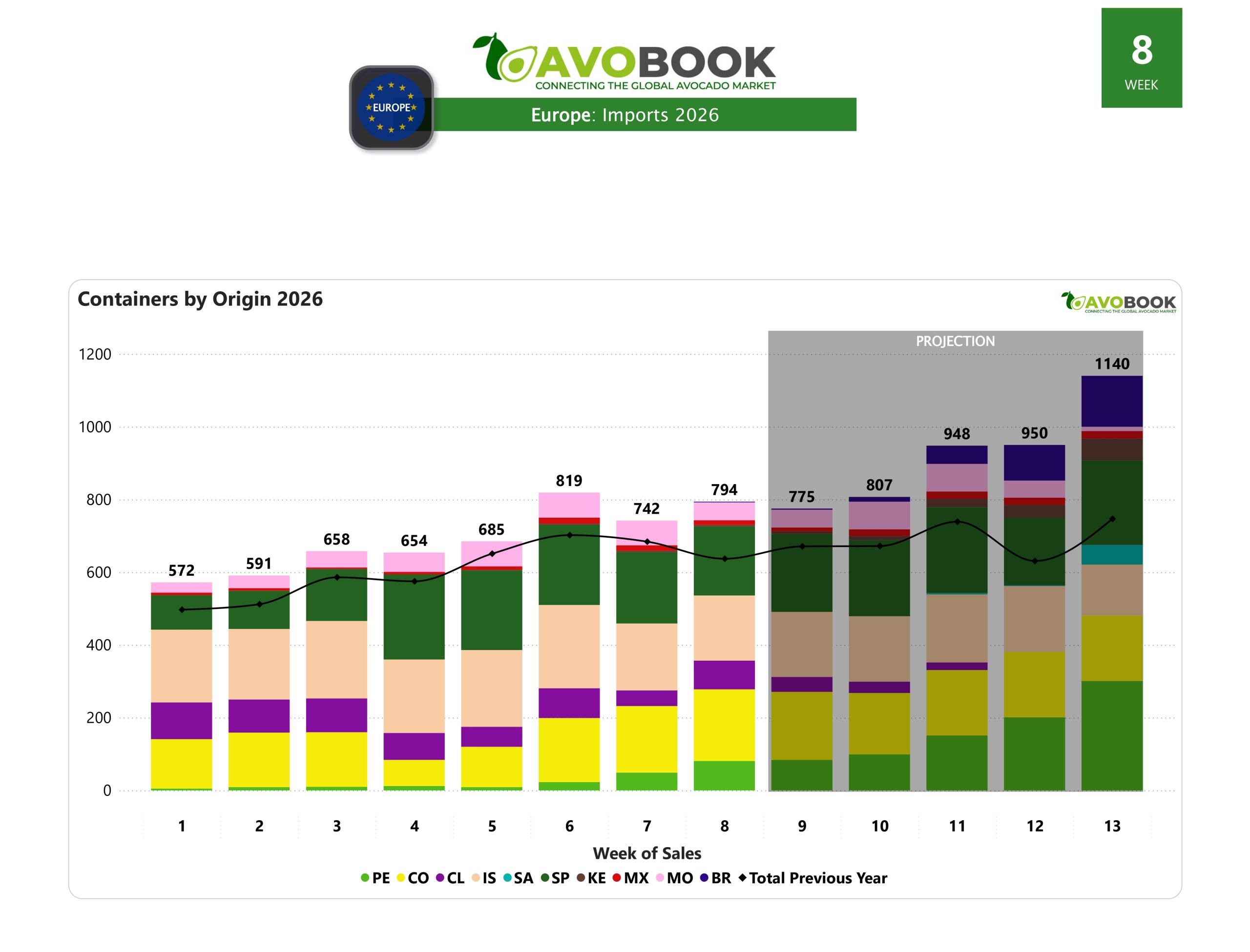 El mercado europeo anotó en la semana 8 un total de 794 llegadas, cifra que representa un aumento de 7% respecto de la semana anterior y un 24% por encima de lo registrado en la misma semana del año pasado. Se trata de un volumen considerado alto para esta época del año, superando los niveles que tradicionalmente se observan en temporadas previas.