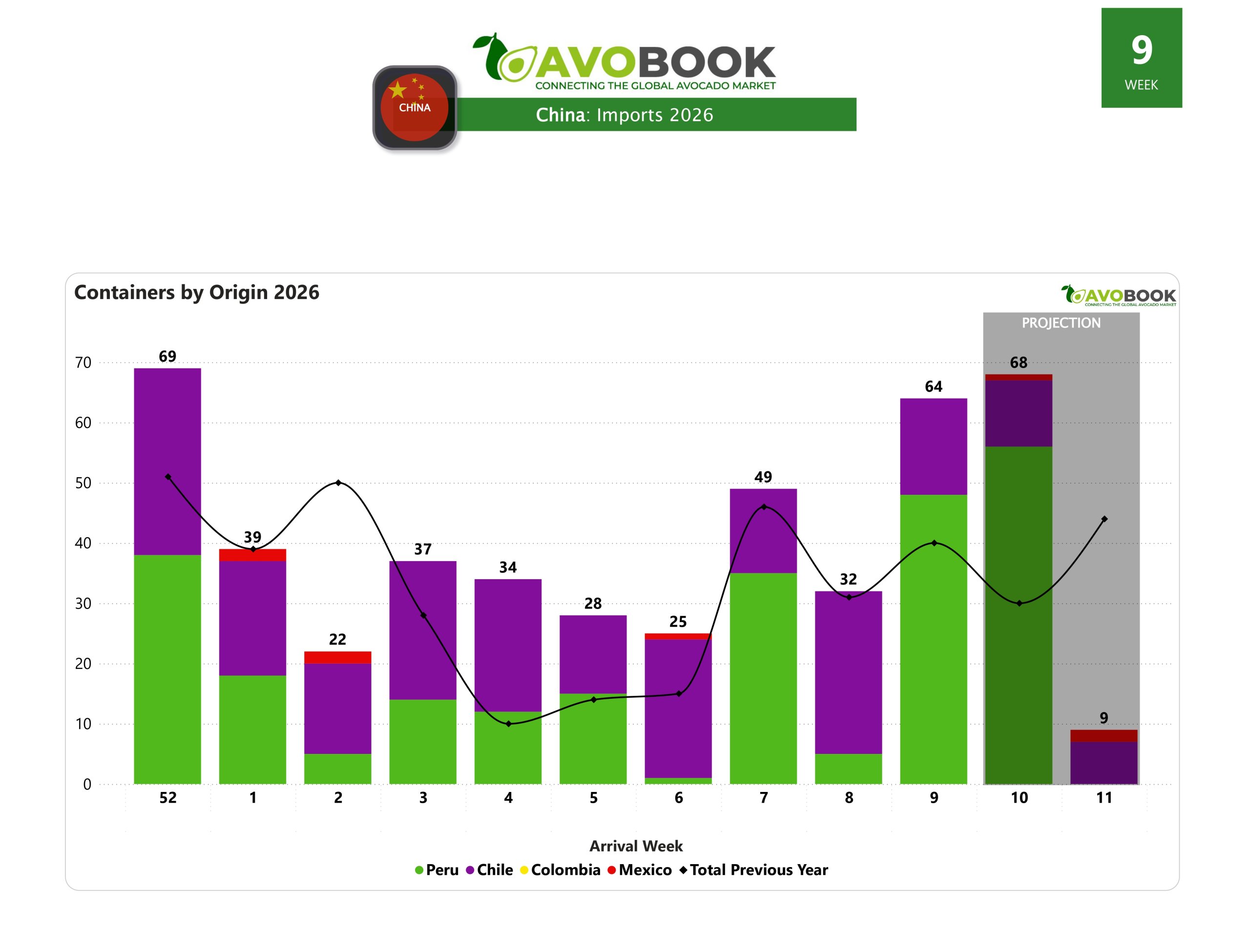 En la semana 9, el mercado chino registró 64 embarques de aguacate, cifra que duplica el volumen recibido la semana anterior y que se sitúa 60% por encima de lo observado en la misma semana de 2025. El dato confirma un repunte puntual en los arribos, en un contexto que ha estado marcado por la intermitencia en los envíos.