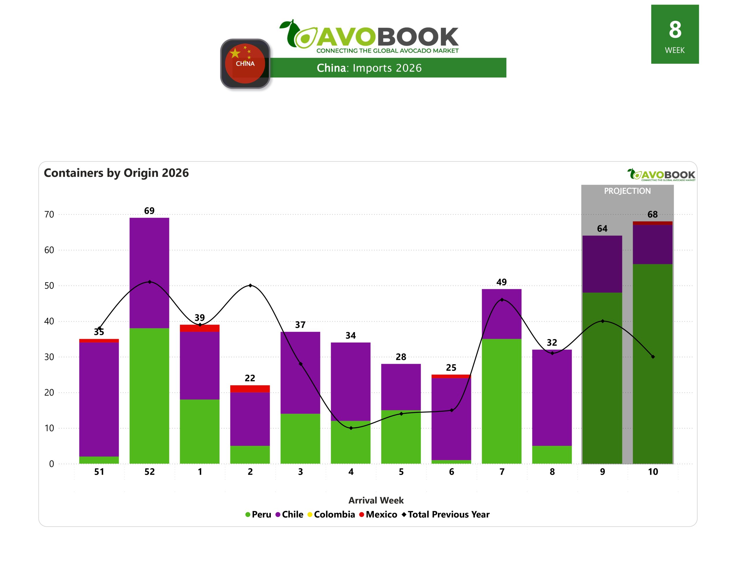 El mercado chino contabilizó en la semana 8 un total de 32 embarques, lo que representa una disminución de 35% en comparación con la semana anterior. A pesar de la caída semanal, el volumen se mantiene en niveles similares a los observados en la misma semana del año pasado, situándose 3% por encima de ese registro.