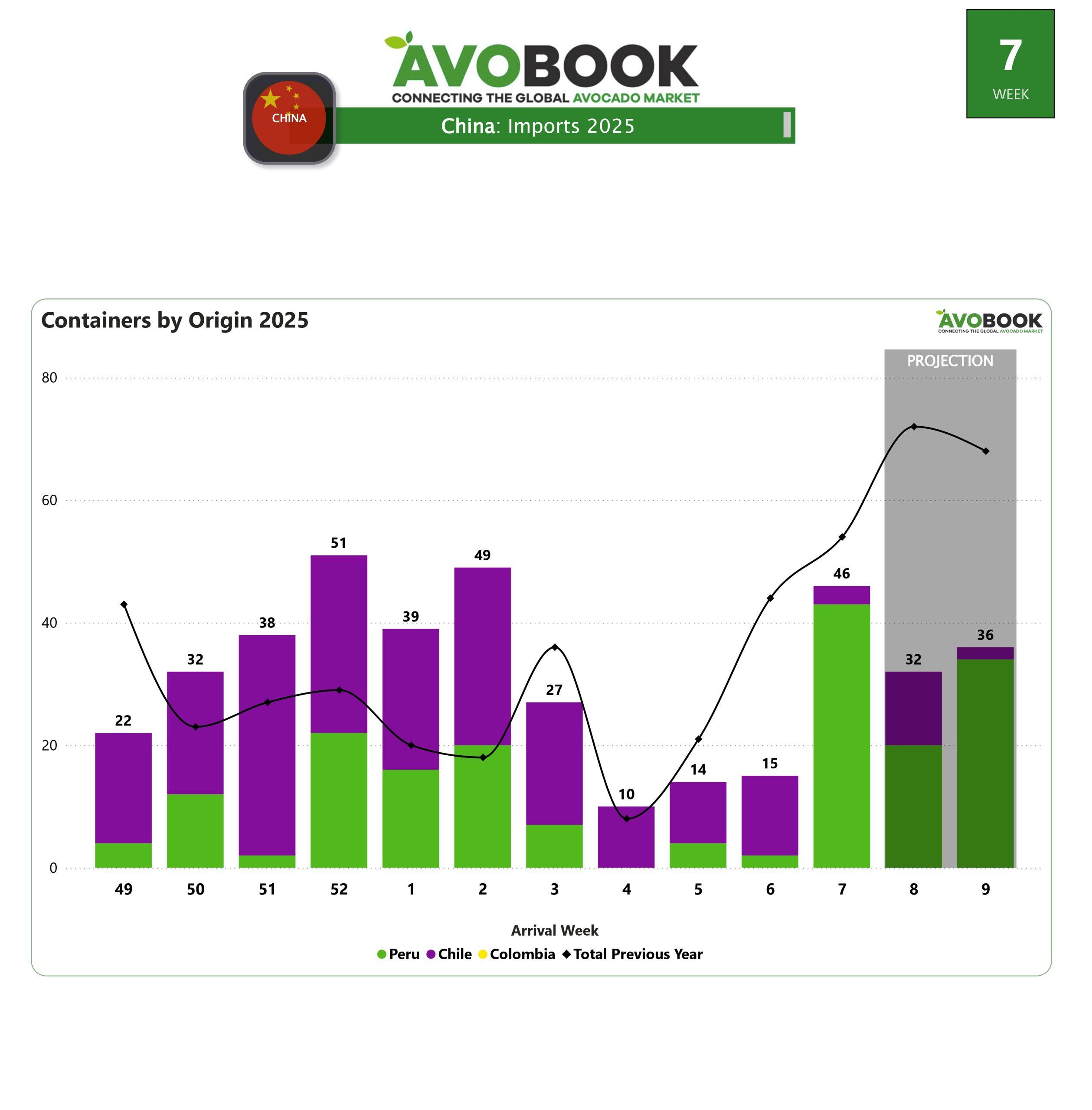Durante esta semana, China recibió un total de 45 contenedores de aguacate, de los cuales el 93% provino de Perú, mientras que el 7% restante correspondió a envíos desde Chile.