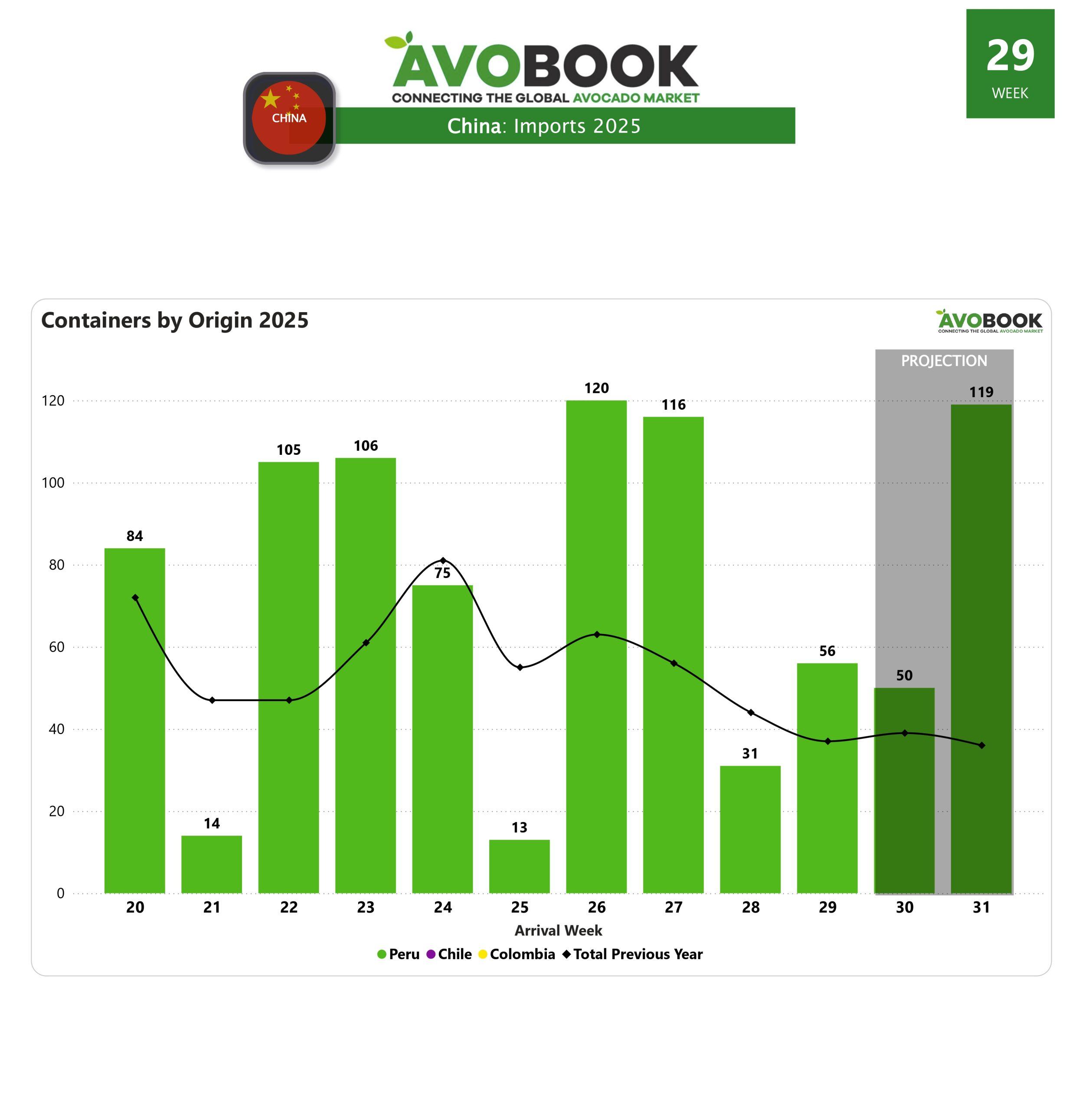 Durante la semana 29, el mercado chino recibió un total de 57 contenedores de aguacate provenientes de Perú, reflejando un aumento en comparación con la semana anterior. Sin embargo, las proyecciones para las próximas semanas indican que continuará la dinámica irregular en el flujo de suministro desde el país sudamericano.